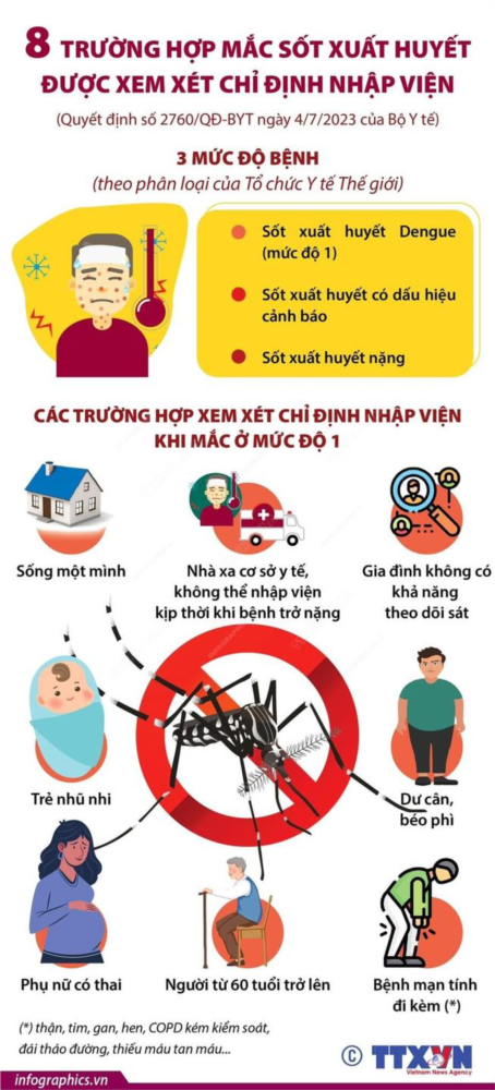 Ngoài việc chỉ định nhập viện đối với các trường hợp mắc sốt xuất huyết ở mức độ cảnh báo và mức độ nặng, theo hướng dẫn mới của Bộ Y tế (Quyết định số 2760/QĐ-BYT ngày 4/7/2023), khi mắc sốt xuất huyết ở mức độ sốt xuất huyết Dengue, có 8 trường hợp cũng được xem xét chỉ định nhập viện.