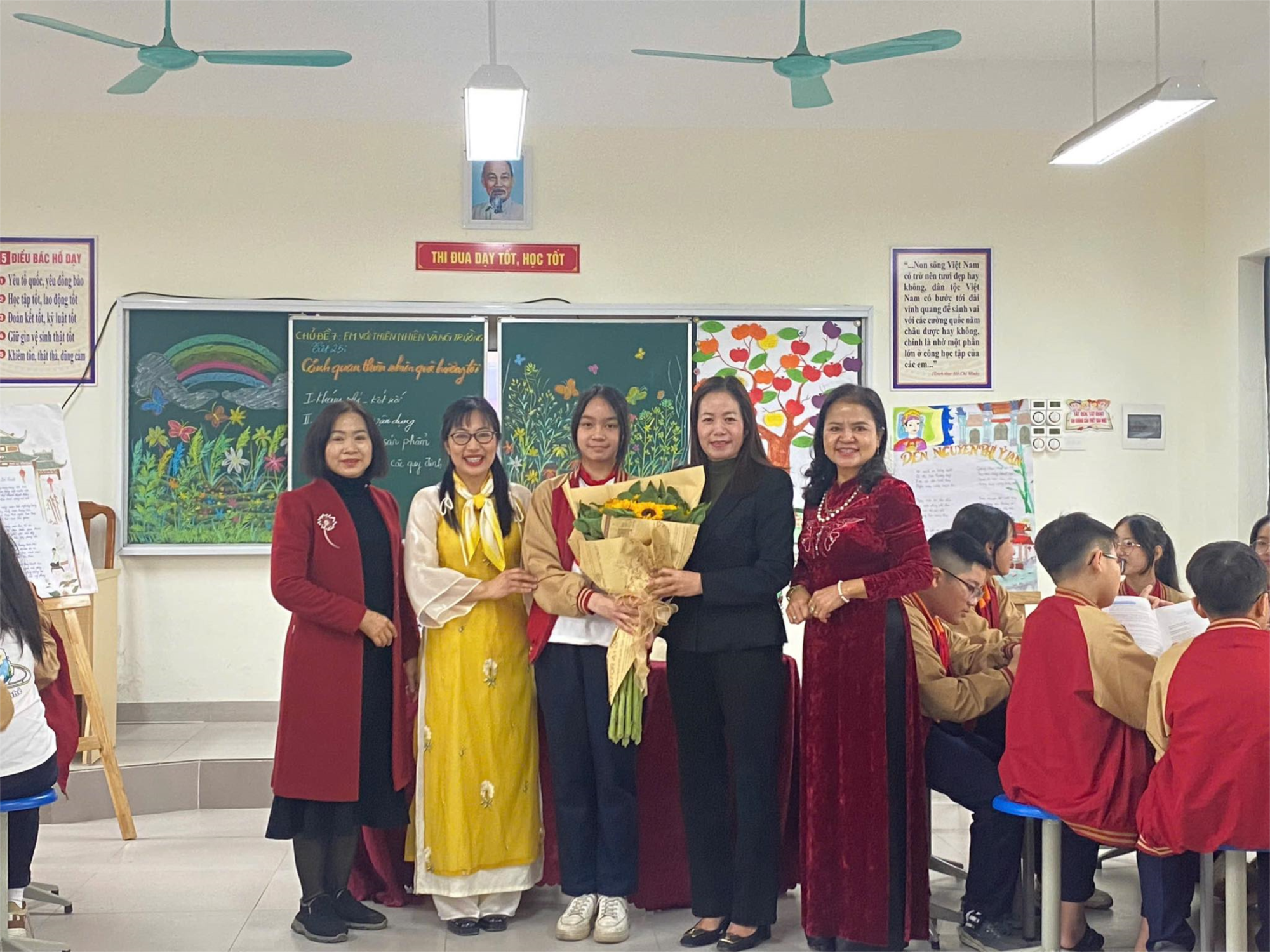 - Cô Nguyễn Thị Ngọc cùng tập thể 7A1 với nội dung học: Cảnh quan thiên nhiên quê hương tôi môn Hoạt động trải nghiệm hướng nghiệp. Cô giáo đã sử dụng các phương pháp học tập mới, ở tiết học các em học sinh được tham gia rất nhiều hoạt động thực tế thiết kế sản phẩm, đi tham quan cảnh quan thiên nhiên... Tiết học tuyệt vời không chỉ mang đến những kiến thức ý nghĩa mà còn khơi dậy trong học sinh sự biết ơn, gắn kết và tình cảm chân thành dành cho thầy cô - những người luôn đồng hành trên mỗi chặng đường trưởng thành. Đồng thời, học sinh được trang bị thêm những kiến thức, những kỹ năng cần thiết cho cuộc sống.