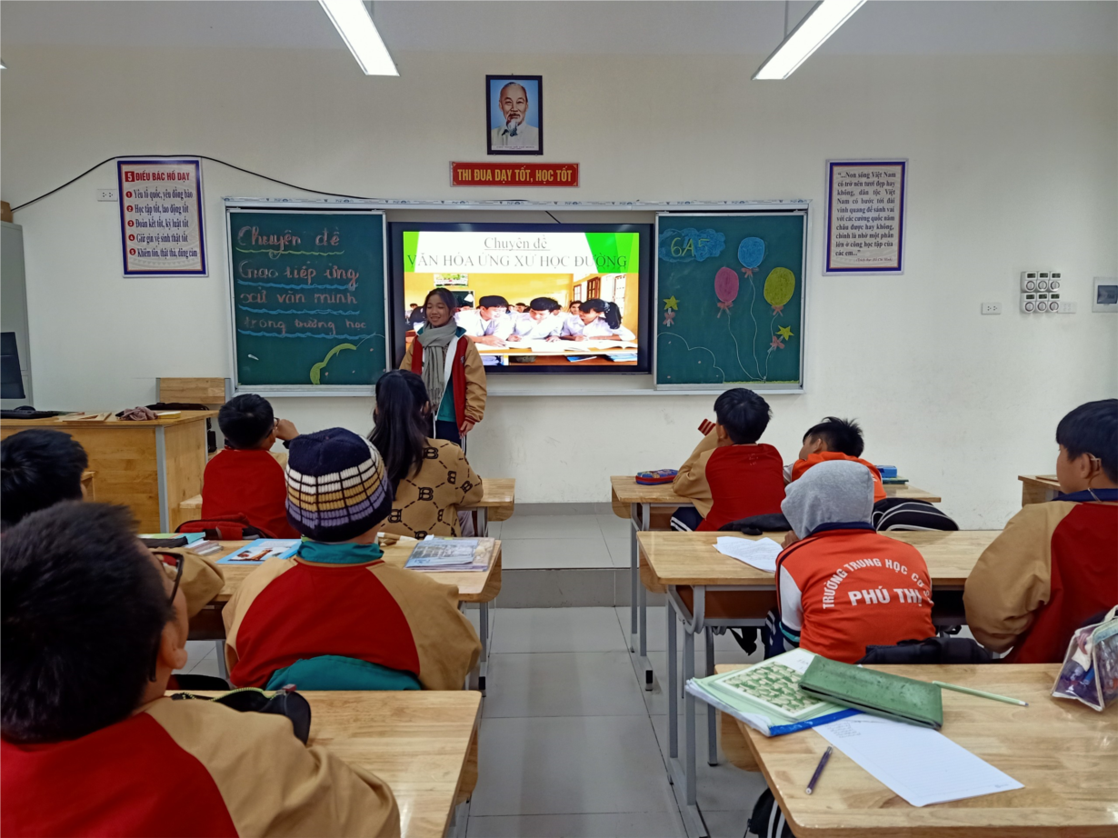 Văn hóa là thể tổng hòa những giá trị vật chất và tinh thần do con người sáng tạo ra trong quá trình lịch sử. Văn hóa ứng xử là một biểu hiện của giao tiếp, là sự phản ứng của con người trước sự tác động của người khác với mình trong một tình huống nhất định được thể hiện qua thái độ, hành vi, cử chỉ, cách nói năng của con người nhằm đạt kết quả tốt trong mối quan hệ giữa con người với nhau. Văn hóa ứng xử chính là những đặc điểm tính cách của cá nhân được thể hiện qua thái độ, hành vi, cử chỉ, lời nói của từng cá nhân trong giao tiếp xã hội. Vậy cần làm gì để xây dựng văn hóa ứng xử và hành vi ứng xử có văn hóa trong môi trường học đường cho các bạn học sinh? Đó là điều mà trường THCS Phú thị rất chú trọng. Trong nội quy đầu năm học và trong các buổi sinh hoạt tập thể hay chuyên đề ngoại khóa, nhà trường đã tuyên truyền tới các bạn học sinh những quy tắc ứng xử văn hóa giúp HS được trang bị nét phong cách nổi bật của HS thành phố Hà Nội : Lễ phép, văn minh , thanh lịch. Văn hóa ứng xử là vấn đề vô cùng quan trọng và cần thiết đối với mỗi người, mỗi học sinh nói riêng và trong môi trường trường học nói chung. Vì vậy mỗi lớp đã thực hiện tiết chuyên đề Văn hóa ứng xử để học sinh rèn luyện kỹ năng giao tiếp rất có ích đối với sự phát triển và trưởng thành của học sinh.