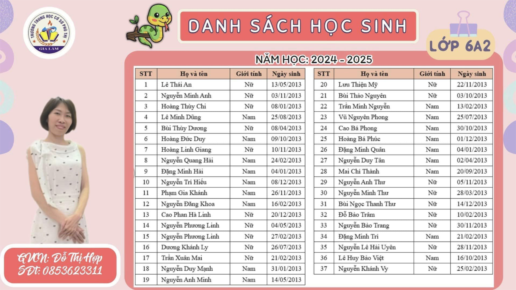 Danh sách học sinh lớp 6A2 năm học 2024- 2025 và Giáo viên chủ nhiệm cô Đỗ Thị Hợp