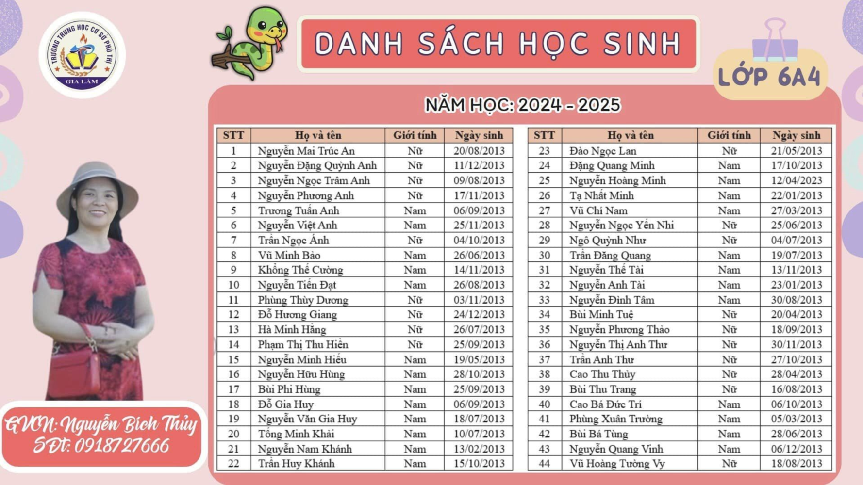 Danh sách học sinh lớp 6A4 năm học 2024- 2025 và Giáo viên chủ nhiệm cô Nguyễn Bích Thủy