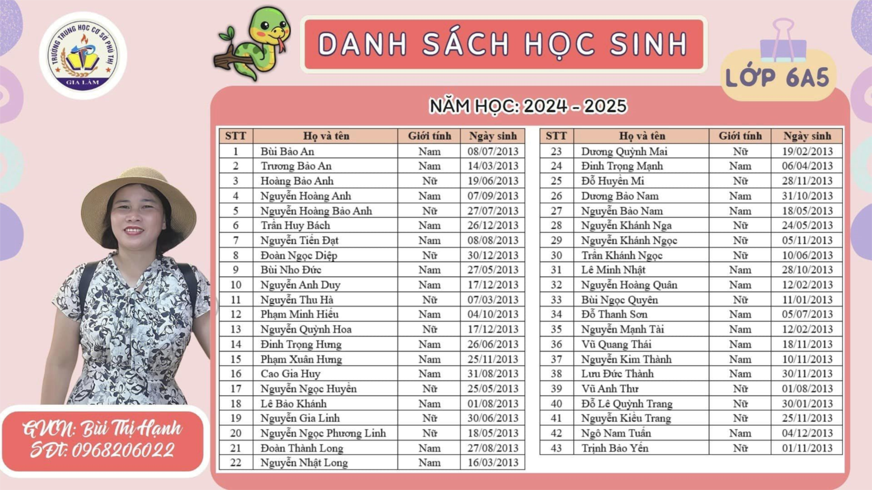 Danh sách học sinh lớp 6A5 năm học 2024- 2025 và Giáo viên chủ nhiệm cô Bùi Thị Hạnh