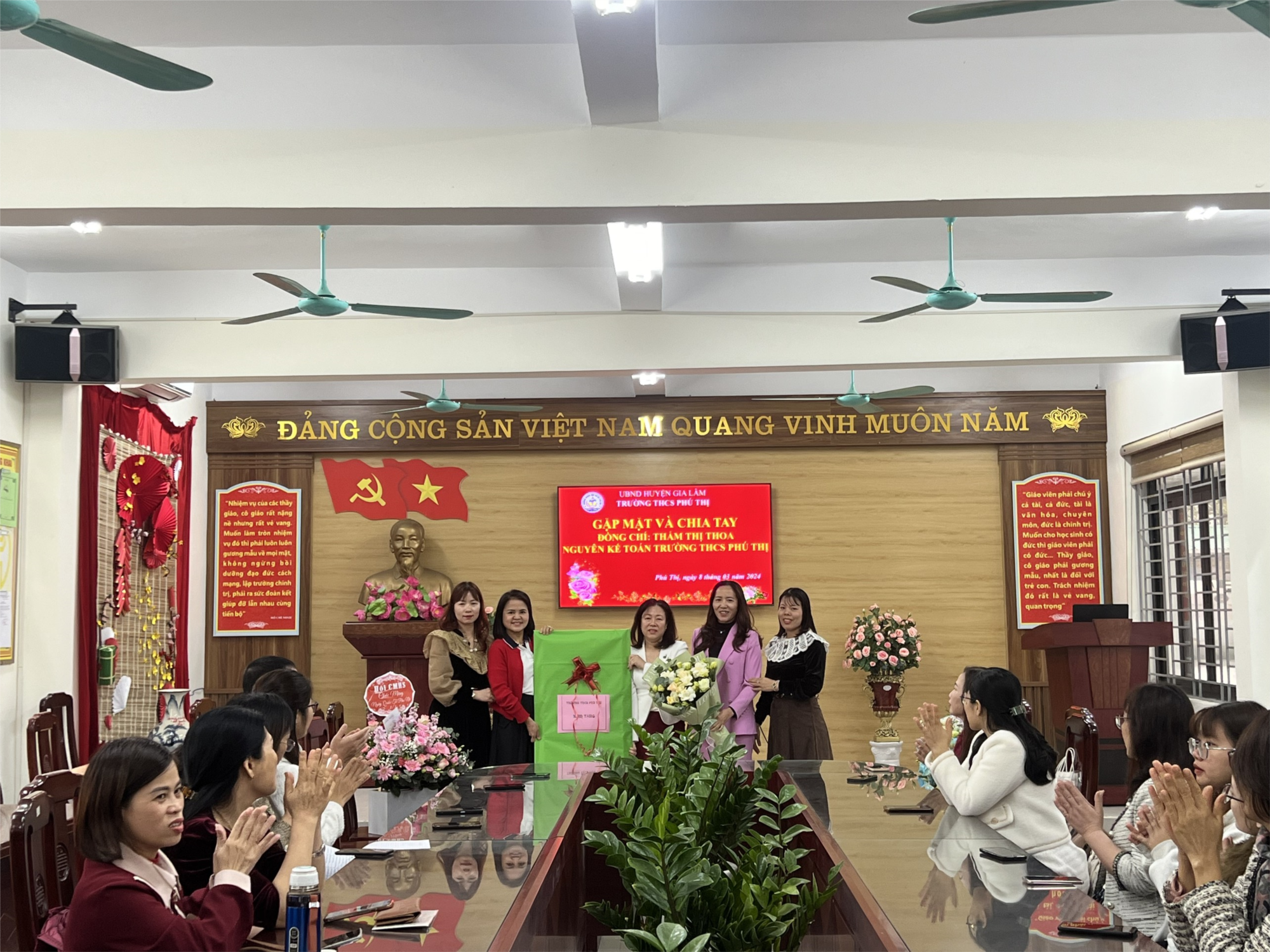 Ngày 8 tháng 3 năm 2024 được sự nhất trí của Chi bộ nhà trường, Công đoàn trường trường THCS Phú Thị long trọng tổ chức buổi lễ gặp mặt, chia tay đồng chí kế toán chuyển trường . Với mong muốn đồng chí Thẩm Thị Thoa hãy giữ lại những kỷ niệm tốt đẹp nhất với các đồng nghiệp. Tham dự buổi chia tay có mặt đông đủ của các đồng chí, CB, GV, NV nhà trường .