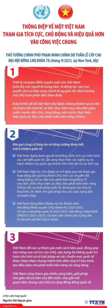 Từ ngày 17 - 23/9/2023, Thủ tướng Chính phủ Phạm Minh Chính dẫn đầu đoàn đại biểu cấp cao Việt Nam tham dự Tuần lễ cấp cao Đại hội đồng Liên hợp quốc Khóa 78, kết hợp hoạt động song phương tại Hoa Kỳ. Qua tham dự Tuần lễ Cấp cao Đại hội đồng Liên hợp quốc Khóa 78 trong tháng 9 và các hoạt động liên quan khác, Thủ tướng Phạm Minh Chính sẽ truyền tải thông điệp mạnh mẽ của Việt Nam đến quốc tế về một Việt Nam yêu chuộng hòa bình, thành viên có trách nhiệm, tham gia tích cực hơn, chủ động và hiệu quả hơn vào công việc chung của Liên hợp quốc trong xử lý các thách thức toàn cầu. Sự tham dự của Đoàn Lãnh đạo cấp cao Việt Nam tại các sự kiện lớn của Liên hợp quốc trong năm nay thể hiện ở cấp cao nhất cam kết của Đảng, Nhà nước và nhân dân Việt Nam sẵn sàng đóng góp tích cực vào nỗ lực chung của cộng đồng quốc tế, nhằm duy trì hòa bình và an ninh quốc tế, phát triển bền vững.