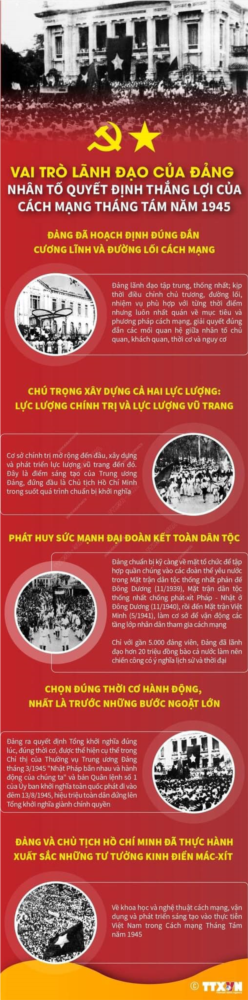 Tháng Tám năm 1945, chớp thời cơ “ngàn năm có một,” dưới sự lãnh đạo của Đảng, đứng đầu là Chủ tịch Hồ Chí Minh, nhân dân ta không phân biệt giàu nghèo, giai tầng, không phân biệt tôn giáo, xu hướng chính trị vùng lên tiến hành cuộc Tổng khởi nghĩa “long trời, lở đất”, giành chính quyền trên phạm vi cả nước, mở ra kỷ nguyên mới cho đất nước. Thắng lợi của Cách mạng Tháng Tám năm 1945 là thắng lợi vĩ đại đầu tiên của nhân dân ta từ khi có Đảng lãnh đạo. Thắng lợi ấy cũng minh chứng cho bản lĩnh và trí tuệ của Ðảng, đứng đầu là Chủ tịch Hồ Chí Minh đã lựa chọn đường lối đấu tranh cách mạng đúng đắn.